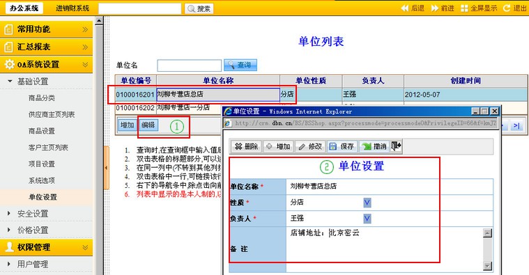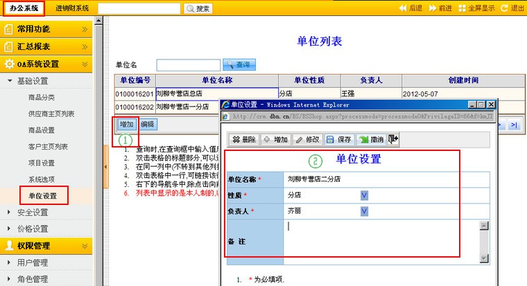 单位设置是为了满足分店开设及分店核算需求。需录入单位的基本信息,如单位名称、负责人、性质和备注等信息。 |