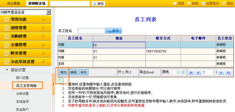 在进销财系统下,点击“分店系统设置”--“基础设置”--“员工主页列表”菜单,进入员工主页列表设置界面,可以进行增加、编辑和删除。具体操作说明事项如下: |
