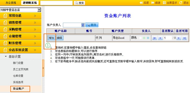 在进销财系统下,点击“分店系统设置”--“基础设置”--“资金账户”菜单,进入资金账户列表界面,可以进行增加、编辑和查询。具体操作说明事项如下: |
