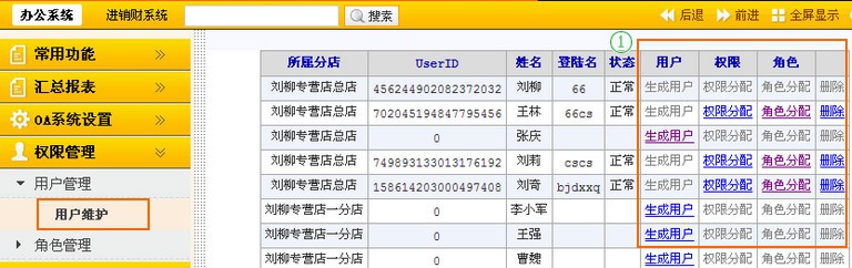 在办公系统下,点击“权限管理”--“用户管理”--“用户维护”菜单,进入用户权限设置列表界面,可以进行生成用户、权限、角色和删除。具体操作说明事项如下: |