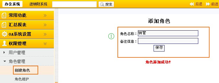 在办公系统下,点击“权限管理”--“角色管理”菜单,点击“创建角色”完成新增角色;点击“角色维护”完成对新增的角色分配权限。具体操作说明事项如下: |