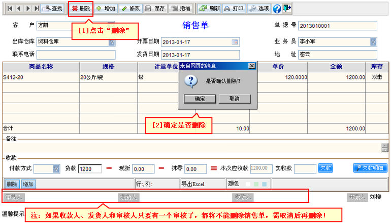 (2)删除销售单:您查找到要删除的销售单后,在菜单栏点击“删除”。打开图示帮助 视频演示