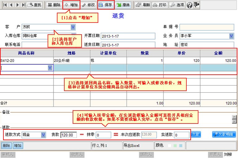 您可以在退货单界面,点击菜单栏的“增加”按钮,进入退货开票界面。打开图示帮助 视频演示
