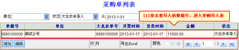 您可以在采购单列表界面,双击要导入的列表行,弹出采购开票界面。打开图示帮助 视频演示