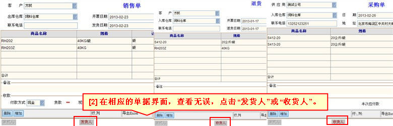 您可以选择业务单据审核,进入相应的界面进行仓库审核,点击列表下“审核”按钮,完成审核,其中销售单点击“发货人”按钮完成发货,退货单和采购单点击“收货人”按钮完成收货。若要取消审核,再次点击按钮就完成取消审核。打开图示帮助 视频演示