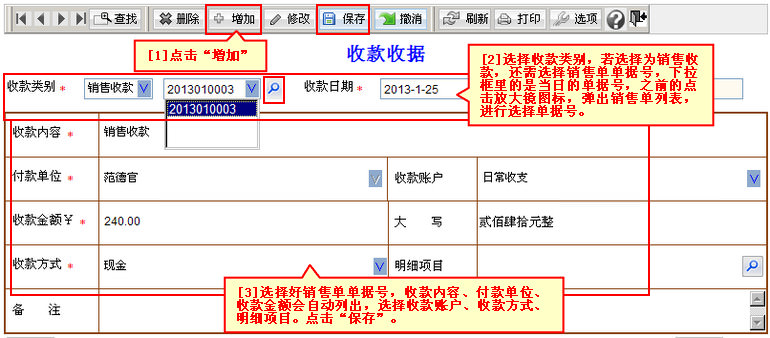 (1)您可以在收款收据界面,点击菜单栏的“增加”按钮,进入开具收款收据界面。打开图示帮助 视频演示