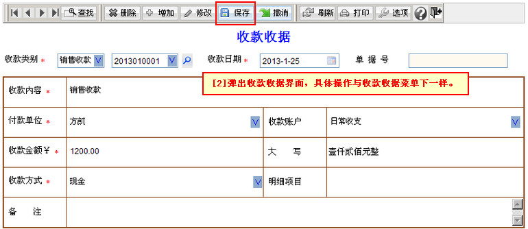 (2)您可以在收款列表界面,双击未完成数据行弹出收款收据界面。打开图示帮助 视频演示