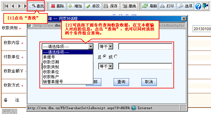 (2)您也可以在收款列表界面选择条件点击“查找”。打开图示帮助 视频演示