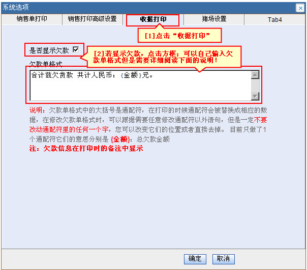 (1)在收款收据打印欠款单的设置:在进销财系统下,点击“分店系统设置”--“基础设置”--“系统选项”菜单,进入收据打印设置界面,点击“收据打印”选择卡。 打开图示帮助 视频演示