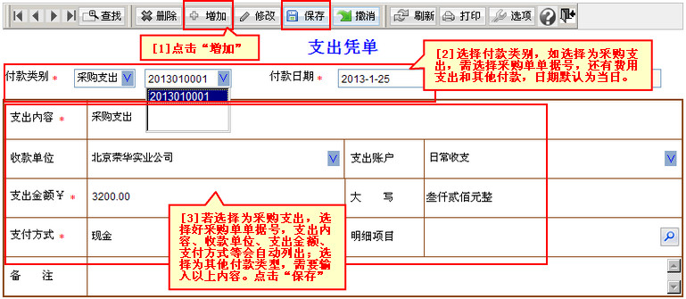 您可以在支出凭单界面,点击菜单栏的“增加”按钮,进入开具支出凭单界面。打开图示帮助 视频演示