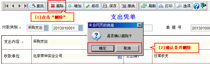 (2)删除支出凭单:您查找到要删除的支出凭单后,在菜单栏点击“删除”。打开图示帮助 视频演示