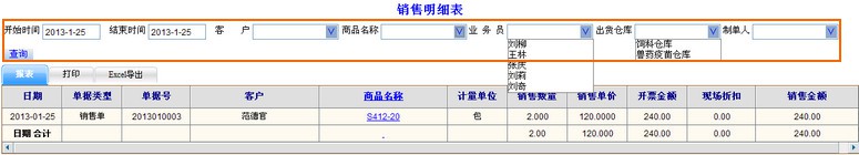您可以在销售明细表,选择日期、客户、商品名称、业务员、出货仓库、制单人等条件查询销售详细信息。打开图示帮助